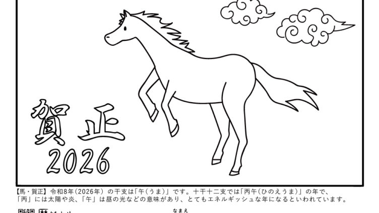 【季節のぬり絵】2026干支「賀正・午、馬の親子、松竹梅」