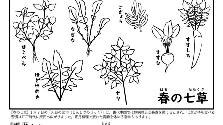 【季節のぬり絵】1月「春の七草、十日戎、祈願だるま」